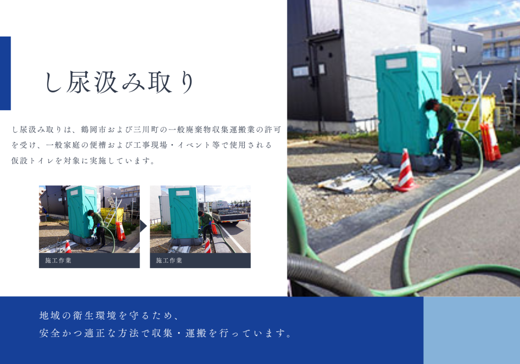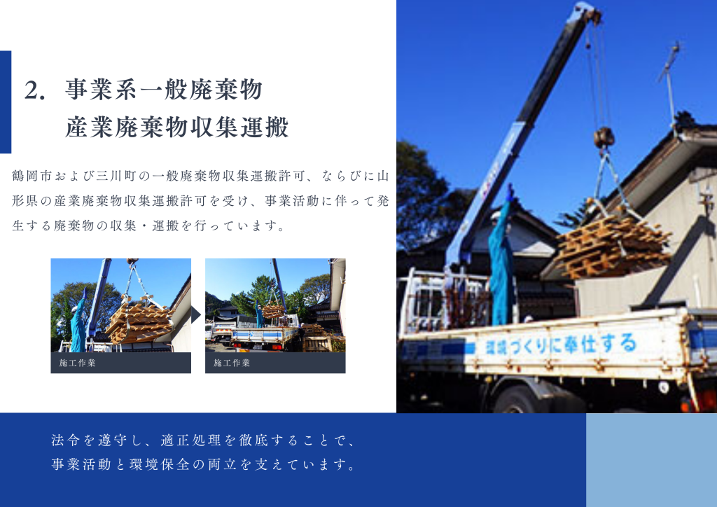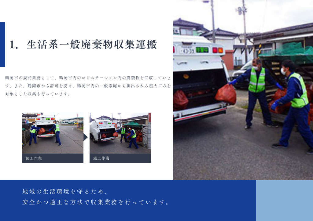 庄内環境整備株式会社Tweet0Share on Tumblr 廃棄物収集運搬 廃棄物収集運搬業務は、大きく分けて 2つの区分 で行っています。 庄内環境整備株式会社は、地域の生活に密着した廃棄物処理・衛生業務を通じて、安心して暮らせる環境づくりに貢献しています。